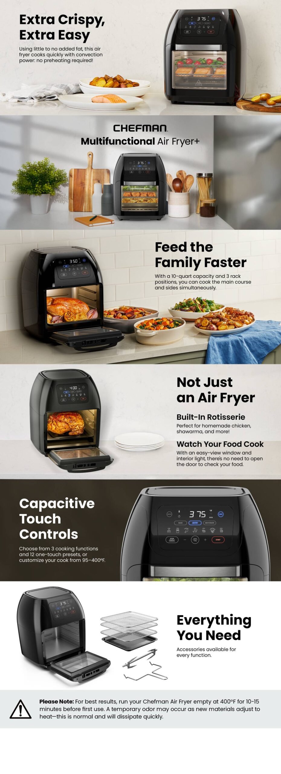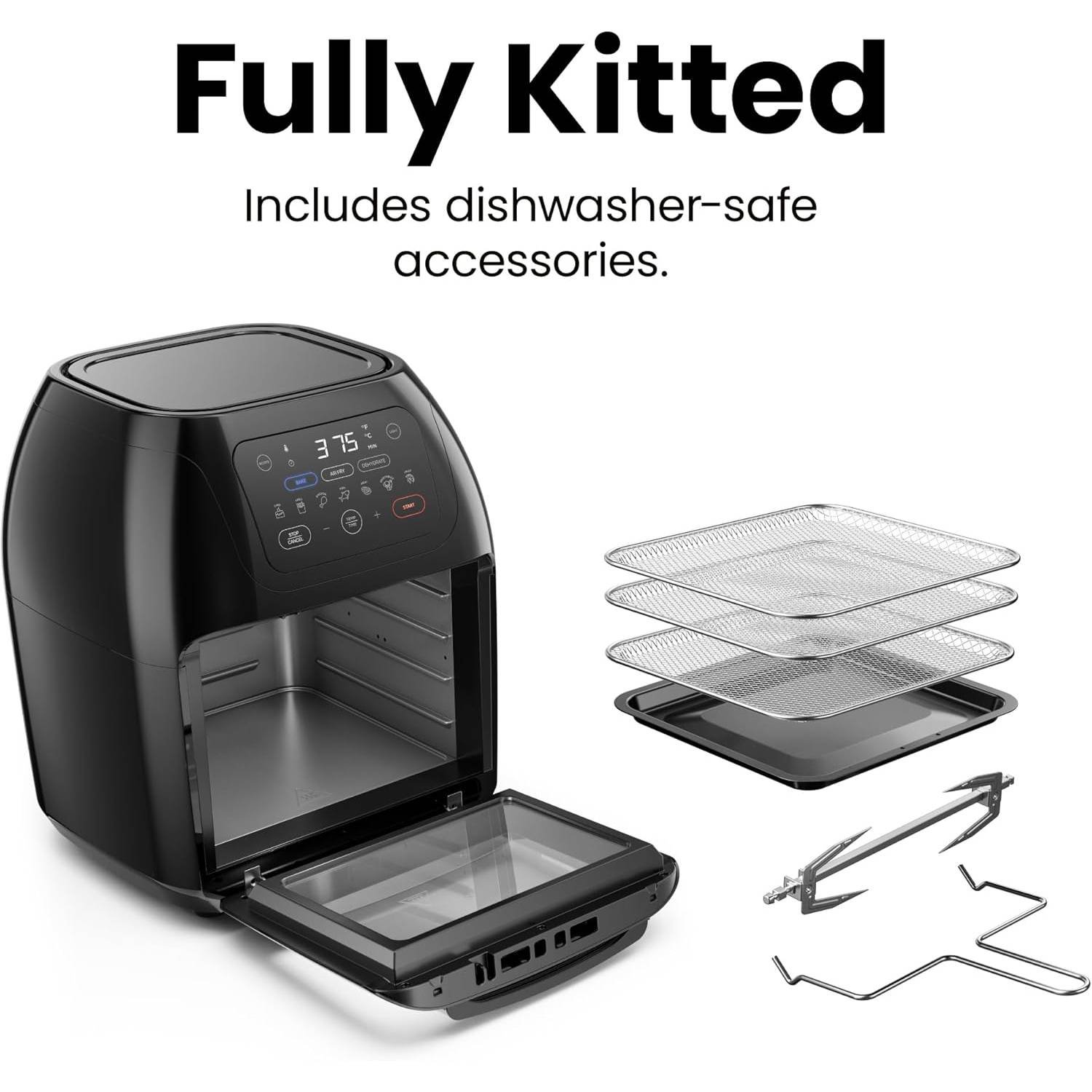 - All-inclusive: Includes three air flow racks, stainless steel rotisserie oven spit with retrieval tool, and a drip tray